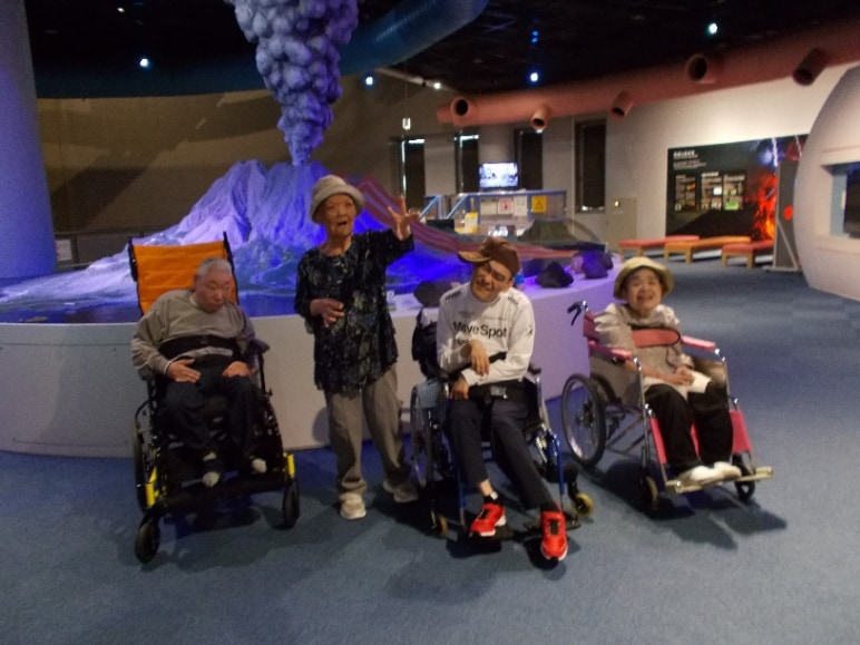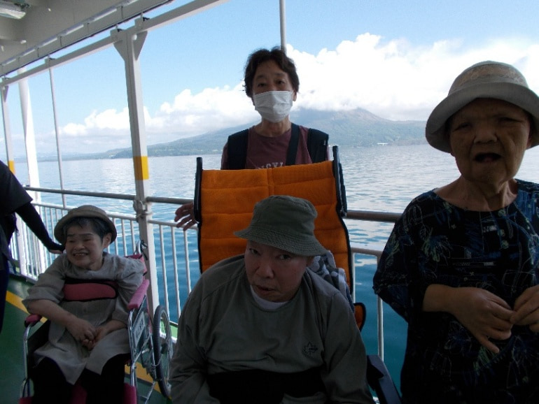 9月19日に小グループ遠足で、鹿児島市立科学館に行きました。当日は晴天に恵まれ、入所者5人、スタッフ5人、責任者、ドライバー2人の計13人が2台のリフトカーに乗り込み、8時30分にオレンジ学園を出発しました。垂水港に近づくとピンクの大きなフェリーが見えてきました。皆さんわくわくしながら9時20分の便に乗り、甲板にエレベーターで上がると桜島を真横に見ながら航海を楽しみました。