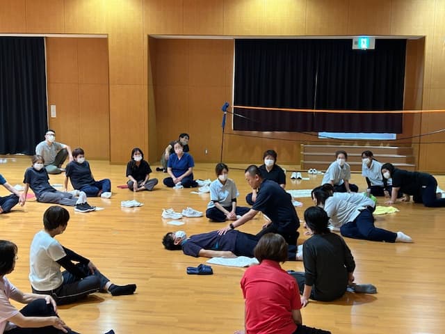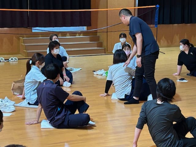 10月9日(木)にオレンジ学園で「健康体操・腰痛予防について」研修会を実施いたしました。当日は合同会社SmileLife代表社員で作業療法士の永山俊介さんの指導の下、30名の参加者が汗を流しました。日頃の運動不足もあり、あちこちで「イテテテ」「ウッ」という声が聞こえましたが、穏やかな語り口で丁寧な指導もあり皆真剣に取り組んでいました。